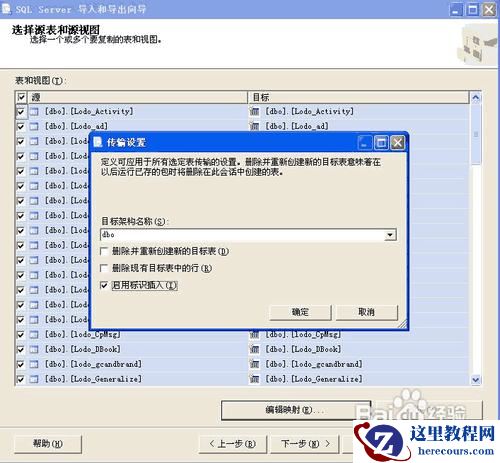 下一步到“选择源表和源视图”选择需要的表后点击“编辑映射”选中“启用标识插入”(自动增长列插入相关)