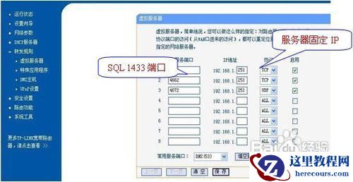 5如果您是通过路由器或交换上网的内网,请到路由配置中为1433端口映射一个端口。由于各路由器设置可能不一样。本文以TP_Link路由器为例介绍如何做端口映射: