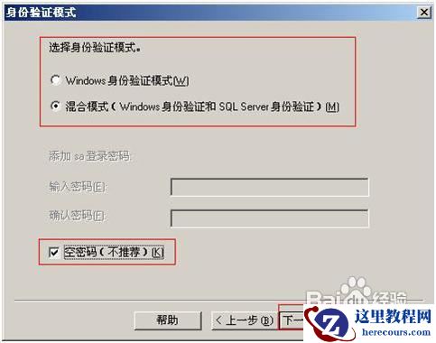 1212.出现“身份验证模式”对话窗口(如图十二),选择“混合模式(Windows身份验证和SQL Server身份验证)”,并钩选“空密码一项”,点击“下一步”。