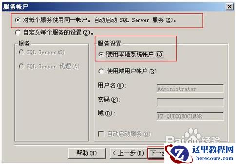 1111.出现“服务帐户”对话窗口(如图十一),选择“对每个服务使用同一帐户。自动启动SQL Server服务(E)”,“服务设置”一栏选择“使用本地系统帐户”,点击“下一步”。