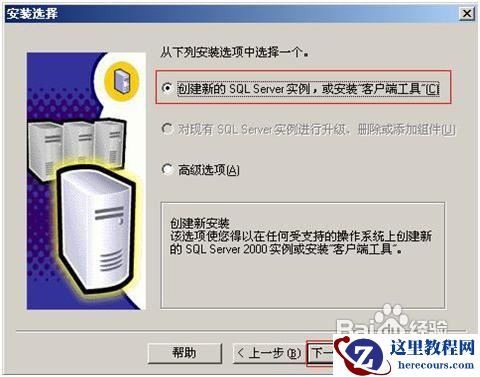 55.出现“安装选择”对话窗口(如图五),选择“创建新的SQL Server实例,或安装客户端工具(C)”后点击“下一步”。