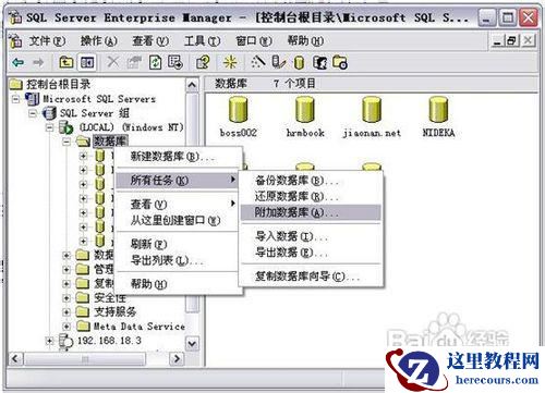 点击“SQL Server组” →“LOCAL” →“数据库”并在“数据库”一栏点右键,选择“所有任务”→“附加数据库”,出现“附加数据库”对话框(如图十八)