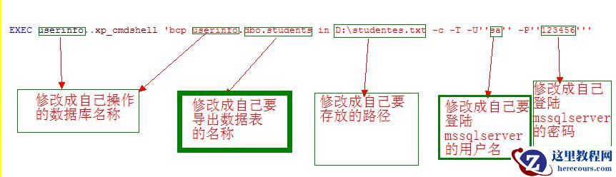 EXEC userinfo..xp_cmdshell 'bcp userinfo.dbo.students out D:studentes.txt -c -T -U''sa'' -P''123456'''