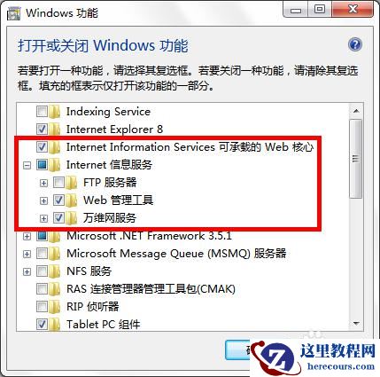 安装过SQL Server的人可能知道,它的有些服务要依赖于IIS,所以为了保证数据库的顺利安装,先启用IIS服务吧!Win7比XP好的一点是:启用IIS功能无需借助系统安装盘了,只要在控制面板里启用即可,如图: