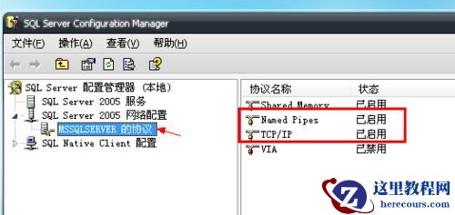 8打开SQL Server ConfigurationManager主页面,找到sql server2005的网络配置里的mssqlserver的协议。就会看到右边的Namedpipes和TCP/IP.把这两个都设置为已启用。