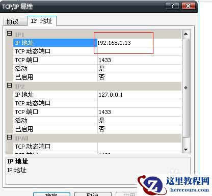 9然后双击进入TCP/IP属性。在IP地址选项。设置好自己的本机ip地址。注意端口号是1433.。设置好之后点击确定。