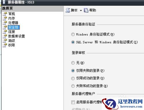 3在属性界面选择安全性。选中右边的SQL Server 和windows身份验证模式。点击确定即可。