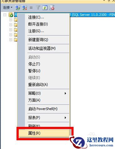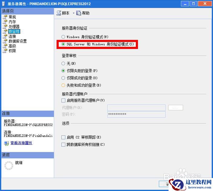 登录后,右键选择“属性”。左侧选择“安全性”,选中右侧的“SQL Server 和 Windows 身份验证模式”以启用混合登录模式