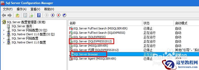 下面开始配置SSCM,选中左侧的“SQL Server服务”,确保右侧的“SQL Server”以及“SQL Server Browser”正在运行。注意对应自己电脑上的SQL名称。