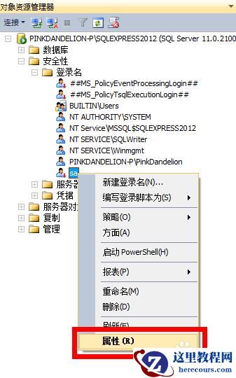 展开“安全性”,“登录名”;“sa”,右键选择“属性”