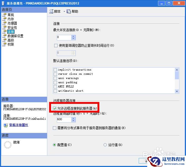 选择“连接”,勾选“允许远程连接此服务器”,然后点“确定”