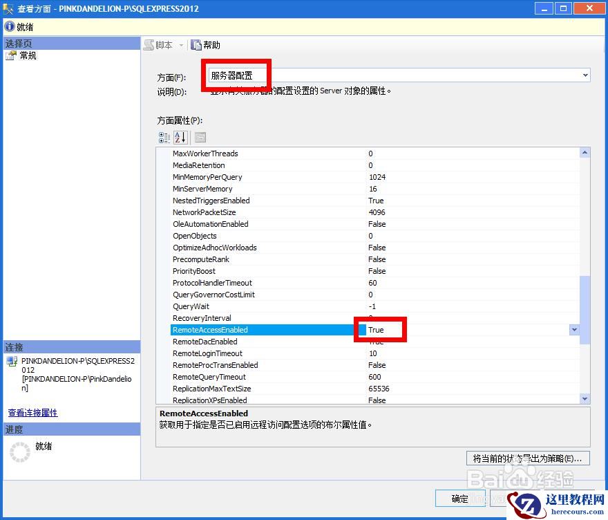 在右侧的方面下拉框中选择“服务器配置”;将“RemoteAccessEnabled”属性设为“True”,点“确定”