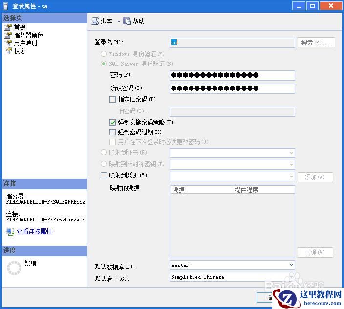 至此SSMS已设置完毕,先退出,再用sa登录,成功即表示sa帐户已经启用