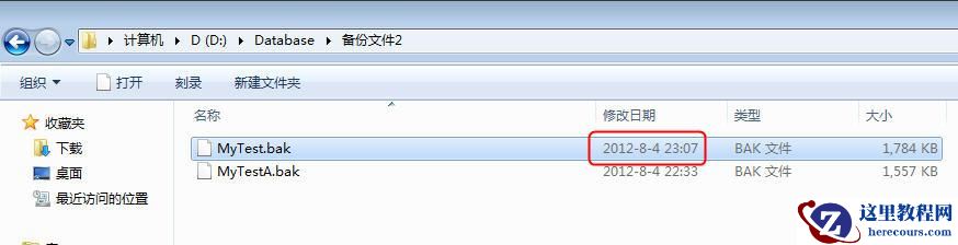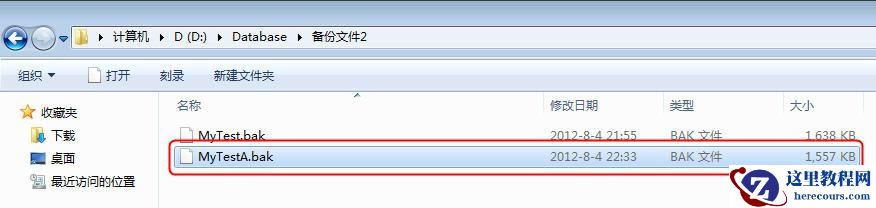 图2-1:备份文件名为【MyTestA.bak】,备份时间为【2012-8-4 22:33】