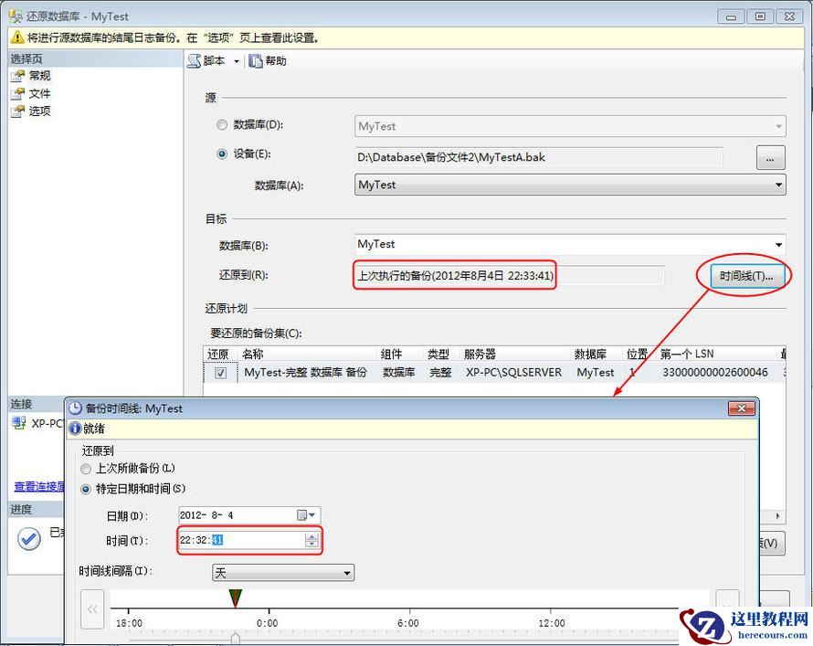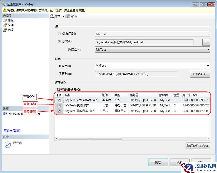 首先进行完整备份【MyTest.bak】,然后再基于此备份文件进行两次事务日志备份,最后一次事务日志备份时间为【2012-8-4