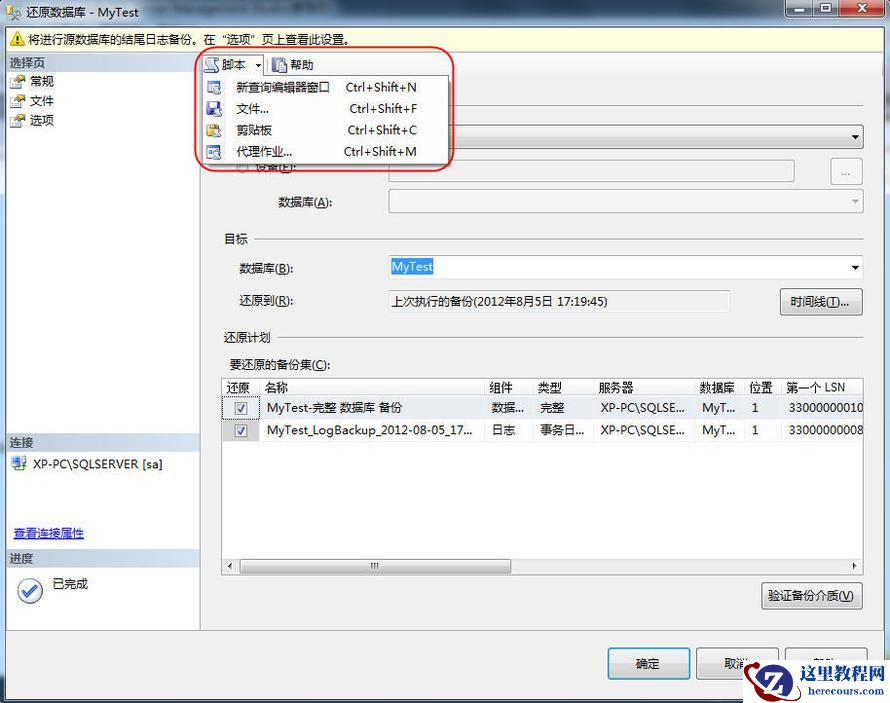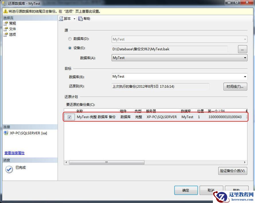 图1-1:备份文件名为【MyTest.bak】,最后一次事务日志备份时间为【2012-8-4 23:07】