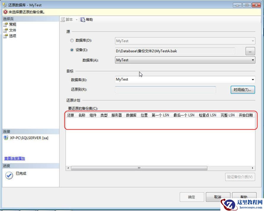 图2-3:只要基于完整备份再还原到某个时间点是不允许的,因为完整备份后没做过任何差异备份或事务日志备份。此时能看到“要还原的备份集”列表里显示为空,无法进行还原。