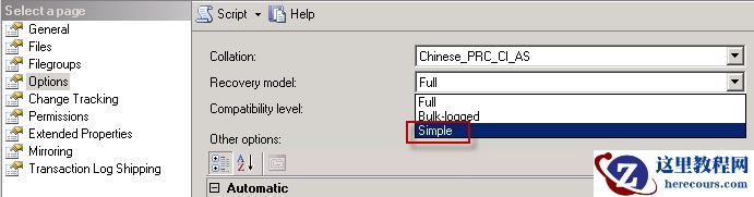 选择要收缩的数据库,点右键 属性->选项,选择 简单模式