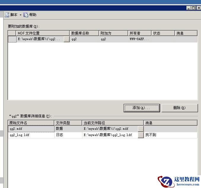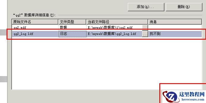 附加到刚刚那个 mdf的文件。注意看下面会提示 .ldf 文件找不到。