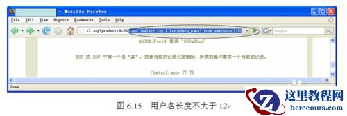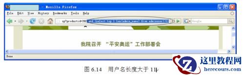 如图6.14所示,在浏览器地址栏中http://www.xxx.com.cn/detail.asp?productid=392后面加“and (select top 1len(admin_name) from adminuser)>11”,含义是取第一条记录,测试用户名长度,按Enter键后,返回正常页面,说明用户名的长度大于11。