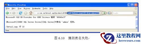 如图6.10所示,在浏览器地址栏中http://www.xxx.com.cn/detail.asp?productid=392后面加“and (select count(*) fromadmin)>=0”,按Enter键后,服务器返回错误提示,说明不存在“admin”表。