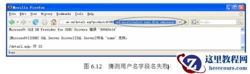 如图6.12所示,在浏览器地址栏中http://www.xxx.com.cn/detail.asp?productid=392后面加“and exists (select count(name)from adminuser)>=0”,按Enter键后,服务器返回错误提示,说明不存在“name”用户名字段。