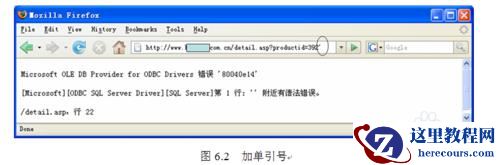 如图6.2所示是在浏览器地址栏中http://www.xxx.com.cn/detail.asp?productid=392后面加一个单引号,按Enter键后,服务器返回的错误提示。
