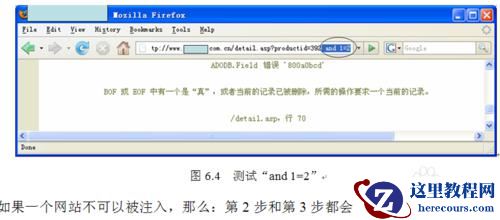 4第3步:测试“and 1=2”。如图6.4所示,在浏览器地址栏中http://www.xxx.com.cn/detail.asp?productid=392后面加“and 1=2”,按Enter键后,服务器返回错误提示。