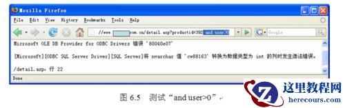 如图6.5所示,在浏览器地址栏中http://www.xxx.com.cn/detail.asp?productid=392后面加“and user>0”,按Enter键后,服务器返回错误提示,可知是SQL Server数据库。