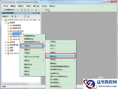 2选则要备份的数据库,这里以PersonTest为例,在数据库点击右键,备份