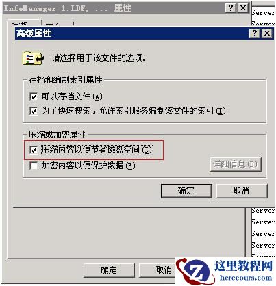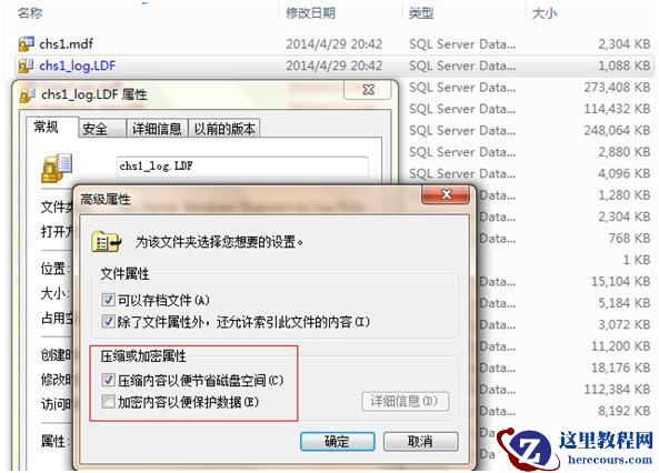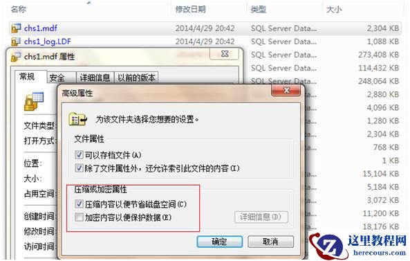 还好,脑子还算灵活,想到Windows系统有一项透明文件压缩功能,可以实现文件正常使用,后台系统压缩存储,达到节省磁盘空间的目的。点击出错的数据库文件,查看文件属性,确实钩选了压缩选项,如下图。