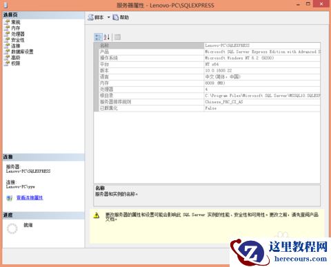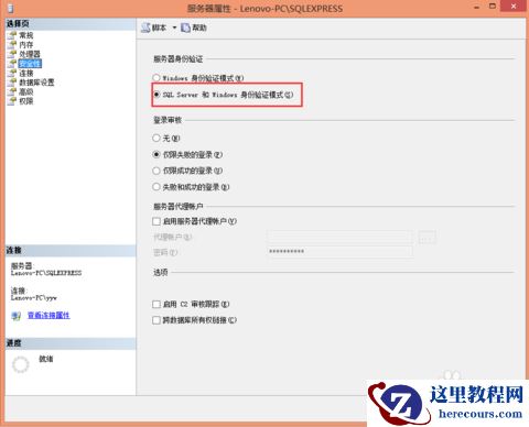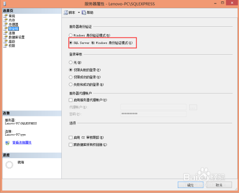 点中实例,然后右键单击,选择【属性】,进入【服务器属性】界面。在左侧选择页中点击【安全性】,然后在右侧安全性设置界面的【服务器身份验证】一栏中选择【SQL Server和Windows身份验证模式】,点击【确定】按钮。