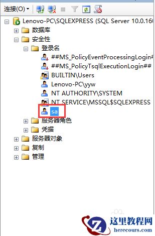 完成上述步骤之后,再次连接还是不能成功。这是因为初次使用登录名sa,此时sa还处于【禁用】状态。点开【安全性】【登录名】,找到登录名sa。