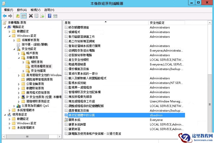 在“本地安全策略设置”对话框中,添加有权运行 sqlservr.exe ( SQL Server 启动帐户)的帐户 。