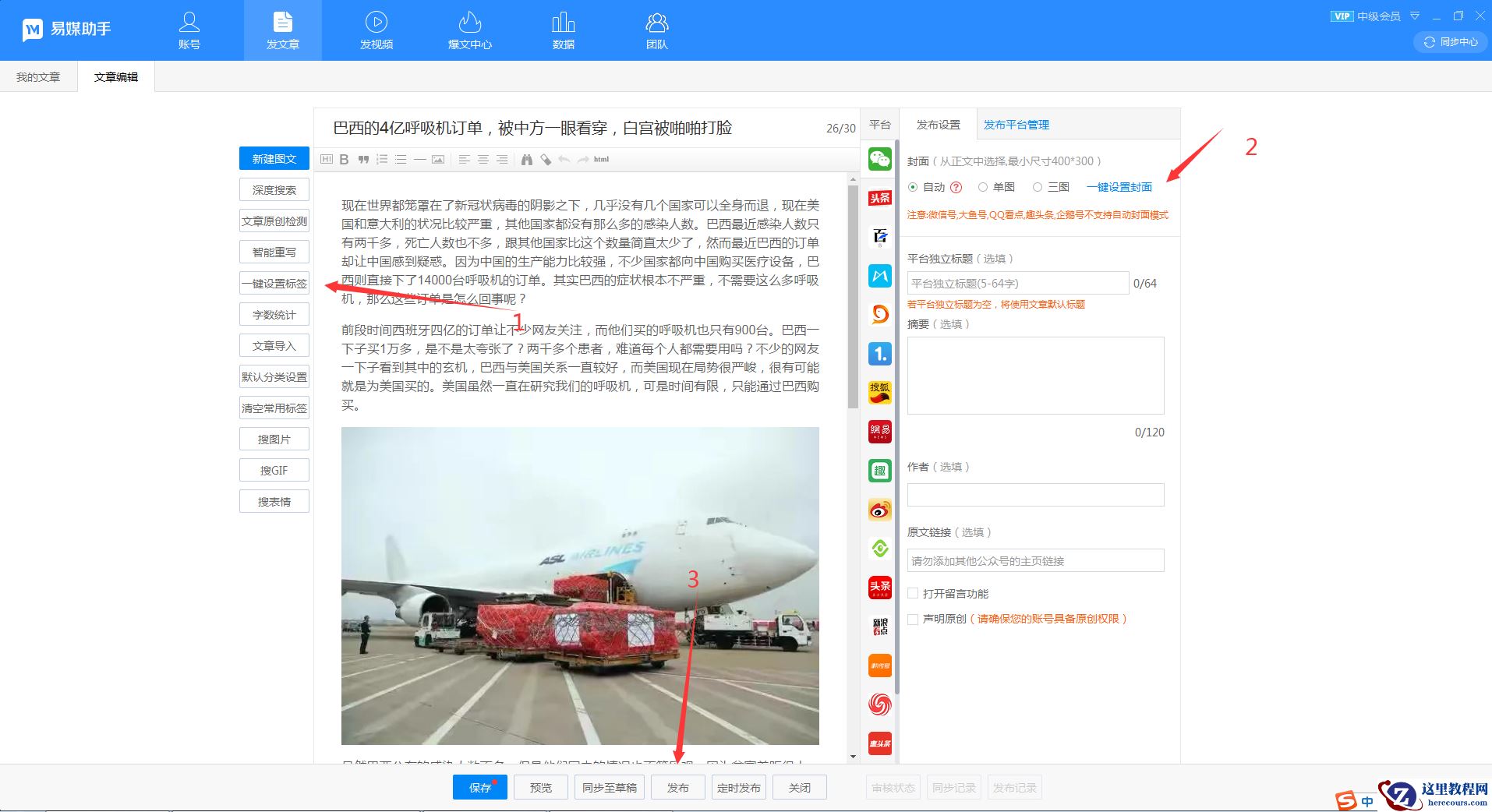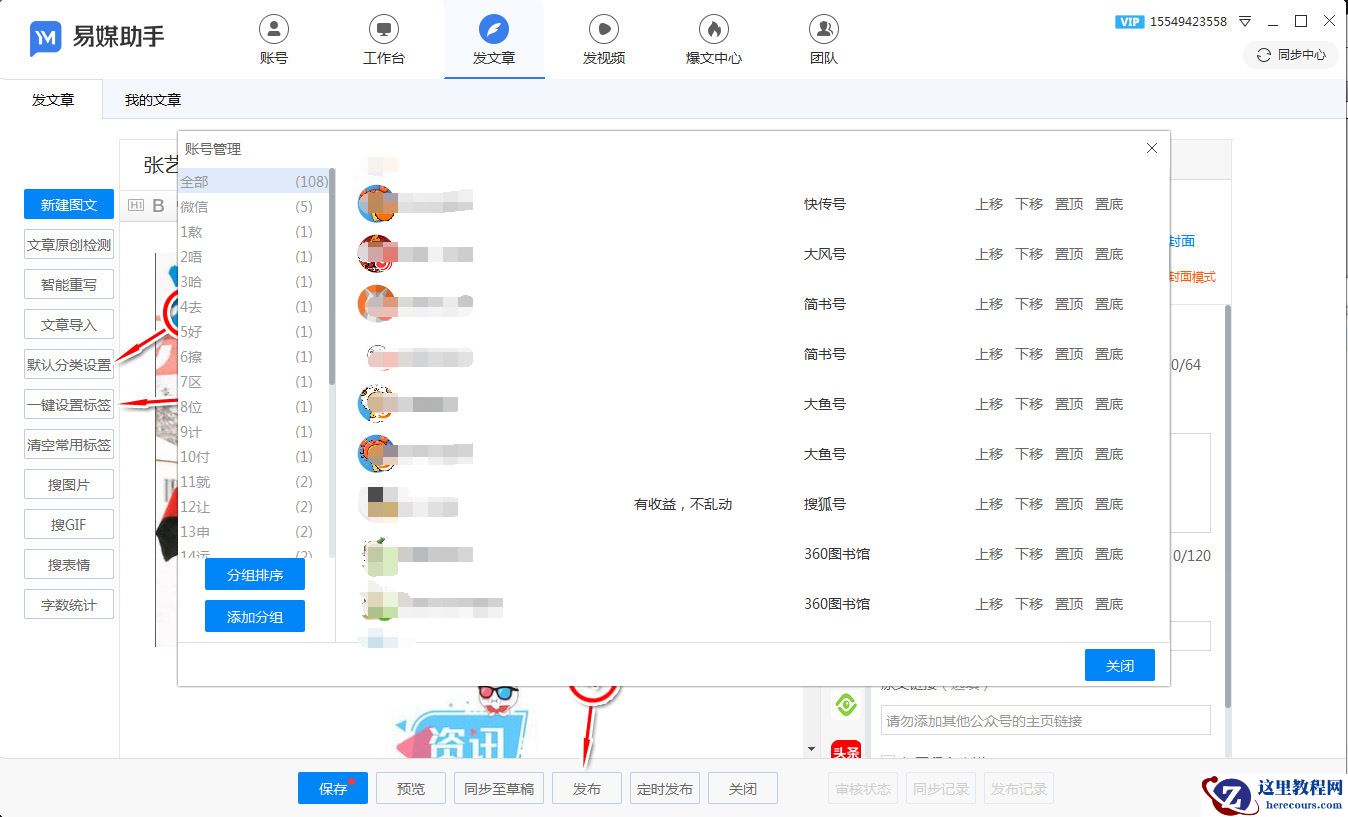 接下来来操作一键发布图文,点击发文章按钮(上方菜单板块),如果初次使用这个工具,那么建议设置下默认分类,今后自动选择你设置的分类,准备好准备发的文章,点击一键设置标签按钮,再点击一键封面(编辑器右上角),倘若个别平台单独设置下功能,选择右侧对应的平台设置想设置的就OK了,只剩最后一步点击发布了,点一下发布,会进入发布账号选择界面,选择要发的平台、就一键发好了。