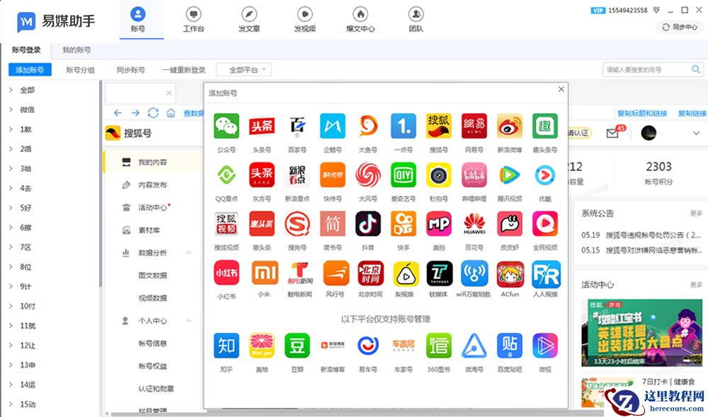 因为这个软件主要功能必须基于自媒体账号来完成,所以找到左上角添加账号,找到准备操作的新媒体平台,若是初次接触此类新媒体工具,选择用账号密码登录,最好不要用扫码的方式登录。