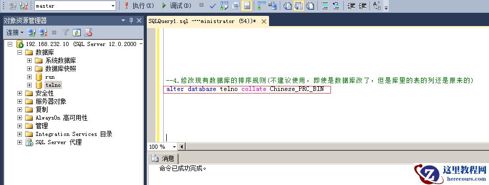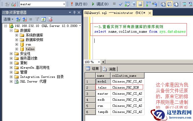 命令:alter database telno collate Chinese_PRC_BIN