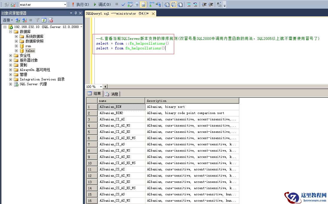 6.查看当前SQLServer版本支持的排序规则 命令: select * from ::fn_helpcollations() select * from fn_helpcollations()