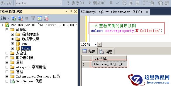 2.查看实例的排序规则 命令:select serverproperty(N'Collation')