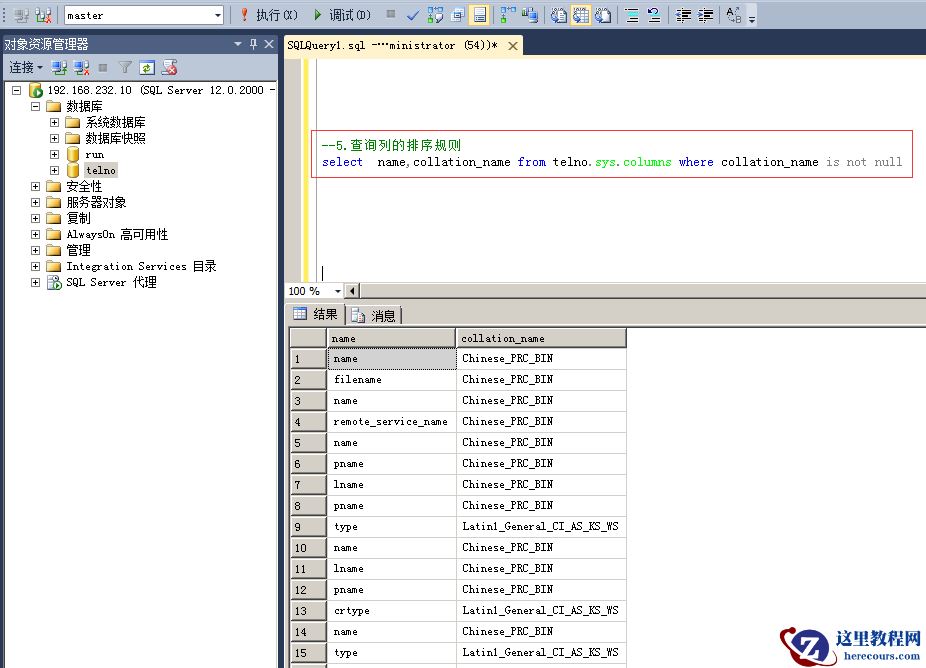 5.查询列的排序规则 命令:select name,collation_name from telno.sys.columns where collation_name is not null