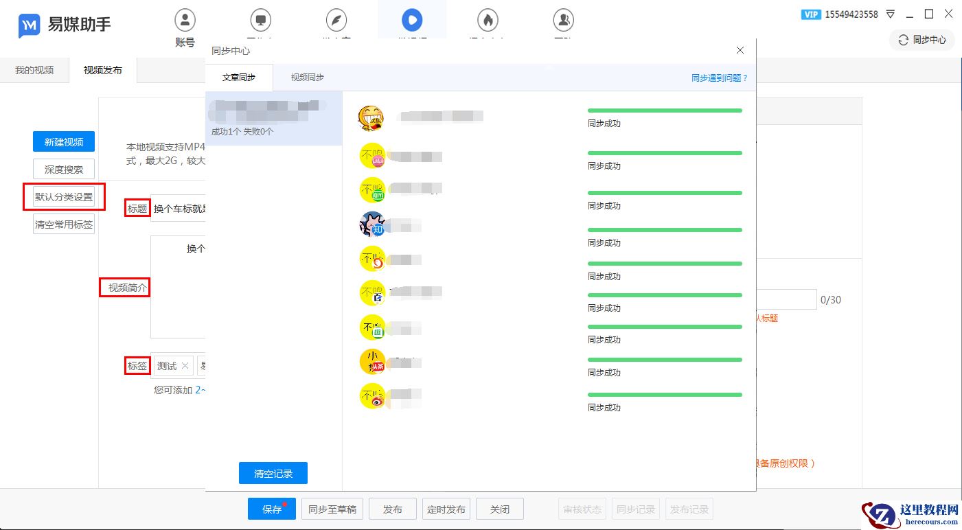 发布文章讲完了,再来演示视频发布,第一步,我们,点下发视频(在软件上面 ),这个时候设置好默认分类,再添加一下你想发的视频,下面结合视频本身填写标题、简介、标签。当你完成了这些填写,点击“发布”图标(最下面那一排),会将你的全部账号显示出来,选择好对应的账号,就同时完成了一个视频的发送,这样做自媒体是不是轻松多了?