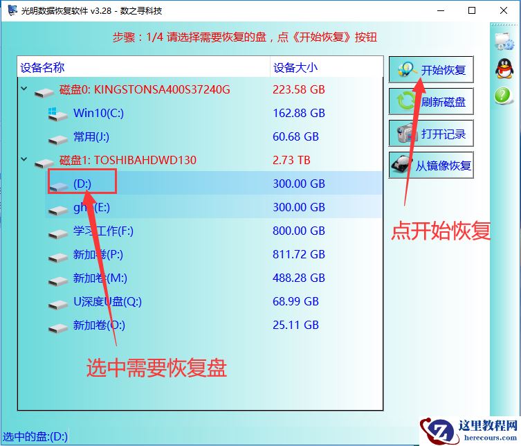 步骤1:软件打开后,在软件中选中需要恢复的盘,然后点《开始恢复》按钮。