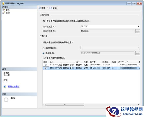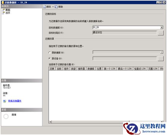 输入目标数据库名称,与发布数据库名 ZS_IB 一致,指定还原的设备为源设备,