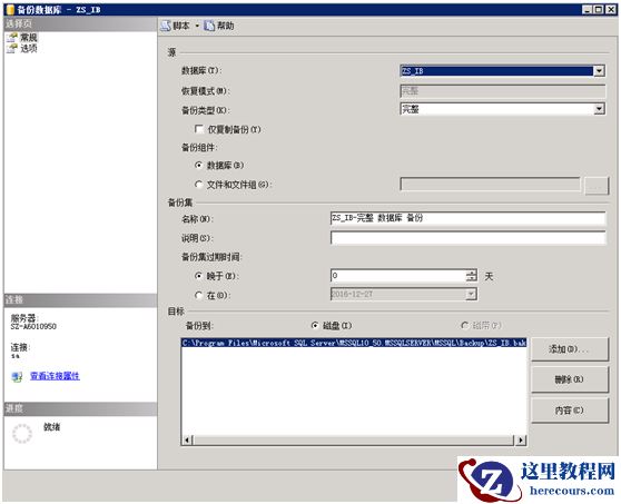 选择备份路径为 主库服务器的某一路径并指定备份名,例如: 路径为 D:\DB_Backup\ZSIB ,文件名为 ZSIB20161227.bak ,点击确定开始备份,最后提示备份成功。