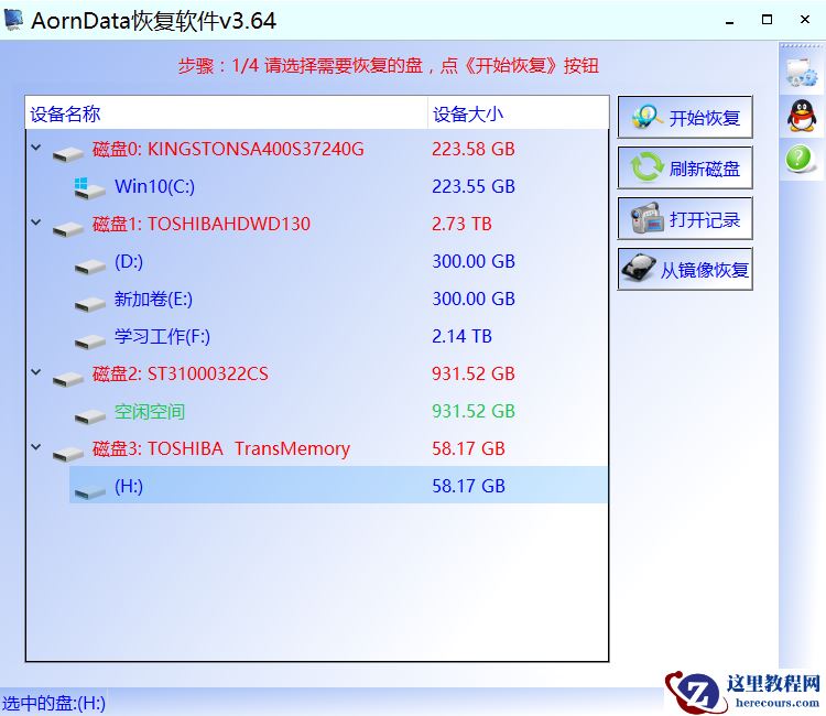 步骤1:先百度搜索并下载程序打开后,选中需要恢复的盘,然后点《开始恢复》按钮