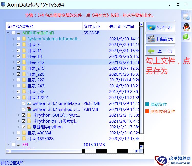 步骤3:扫描完成后文件夹名变《目录+数字》,没关系这是最外层的根目录被破坏导致的,里面的文件名都是正常的。将需要恢复的资料勾选,接着点右上角的保存,《另存为》按钮,将勾选的文件复制出来。