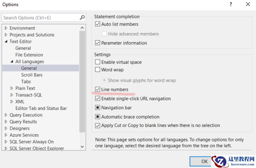 In the Options dialog box navigate to Text Editor > All Languages> General