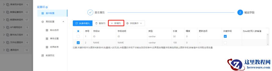 配置输出字段:根据目标表的字段情况,手工点击新增列完成输出字段配置。