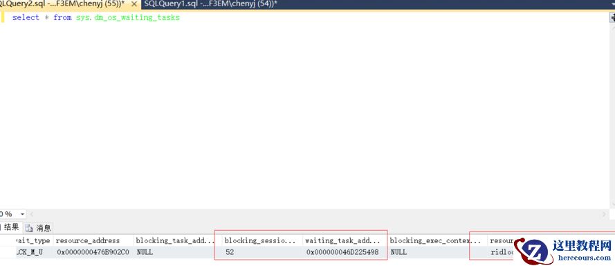 select * from sys.dm_os_waiting_tasks where wait_type like 'LCK%';此语句可以定位获取数据库中的阻塞, 视图中有涉及的等待的session id, 等待的资源类型。以下截图展示的是更新时session id是52的会话阻塞了另一个会话,比较重要的是这个blocking_session_id与resource_description。可以根据resource_description中的fileid, dbid, pageid等信息定位到阻塞时涉及的对象。