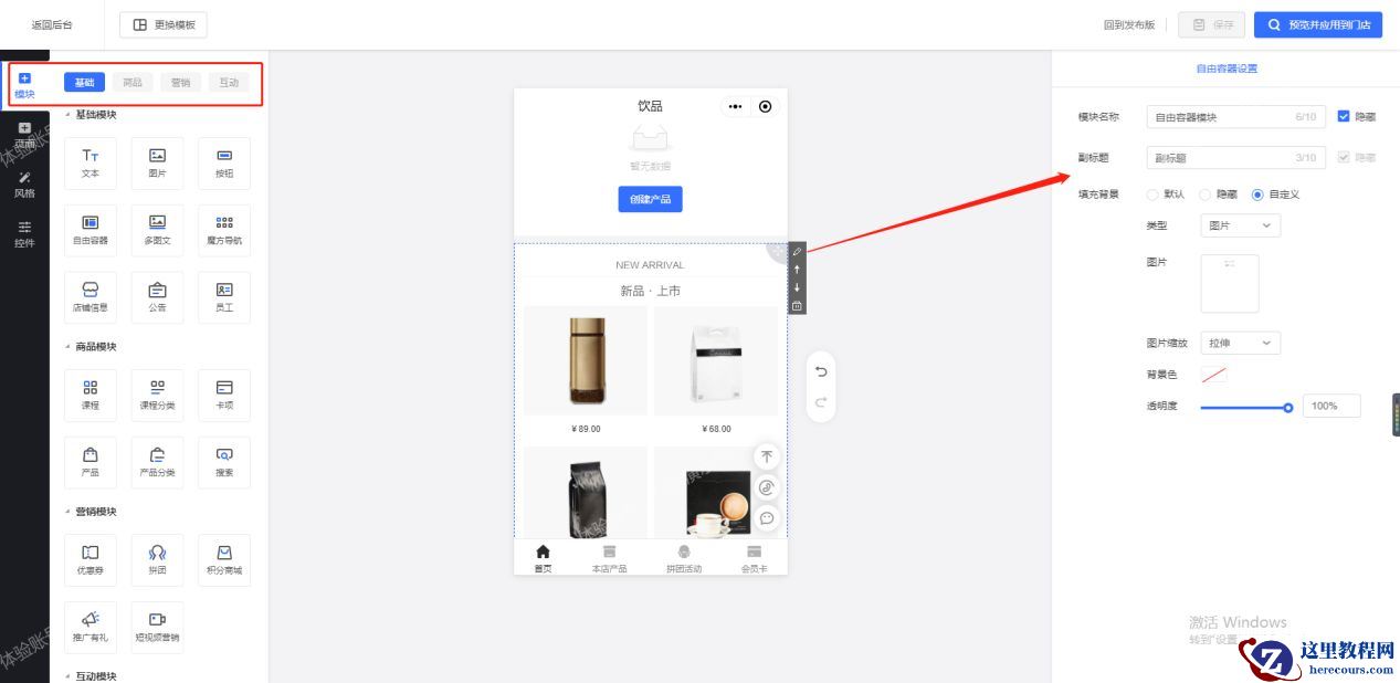 而在左侧的【模块】选项中,可选择添加店铺信息、公告、产品、优惠券、积分商城、短视频营销以及自助买单、表单、评价等功能至小程序店铺中,丰富完善小程序店铺功能。